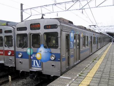 最近流行りの車体広告って、はっきり言ってあまり好きじゃないですね。個人的に。石原都知事の鶴の一声で、東京を走る、バスや電車の車体への全面広告は解禁になってから、しばらくはバスのみだったのが、最近、JRの山手線や地下鉄の銀座線、丸の内線にも車体広告を施した車両が走るようになった。もちろん、鉄道会社にとっては、これは貴重な収入源になるわけだし、頭から反対するつもりは毛頭ないし、車体を使った広告は特に都区内の場合は多くの人の目にとまり、広告効果も絶大なものであろう。しかし、一応は街の美観を損なわないような広告に限るというような"あいまい”な制限がついている。確かに、美観を損なわないものであればいいのかもしれないが、美的センスのすぐれているのはあまりないように思える。車体広告が解禁になる前は、鉄道事業の関連事項であれば、認められていたわけだが、例としては、東急の田園都市線の8637Fの東急ケーブルTV号(現在のITS COM)がそれである。この列車は前面の赤帯を青帯に変更して先頭車の側面にはシャボン玉模様を配して遊び心が感じられ、乗る人間にとっても、楽しいものであった。最近のものでも、江ノ