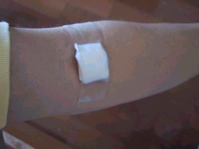 | たかが10ccの採血なのに、ちょっと大袈裟。さすが、赤十字。 会社の健康診断じゃ、ちっちゃなシール貼るだけだよ。 でも、やっぱり、こんなんでも、ちょっとチクッてするんだよね。(泣) |
