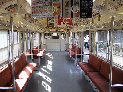 | 車内の様子。 20M4ドアという日本の通勤型のスタイルを確立させました。 この構造は現在の新型車両であるE231系も踏襲してるところをみると、 この車両がいかにエポックメーキングだったかが分かります。 |