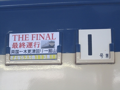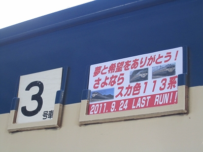 2011年9月23日と24日には、両国発でさよなら運転が実施され、また、各種記念弁当もいろいろ発売された。9月24日には、「快速 青い海」「快速 白い砂」としてヘッドマークが付けられての運転となり、有終の美を飾った。今回は房総で最後の活躍をするありがとうヘッドマークを付けた姿と9月24日のさよなら運転の様子、さらに2010年から撮りためていた113系を紹介していくことにする。