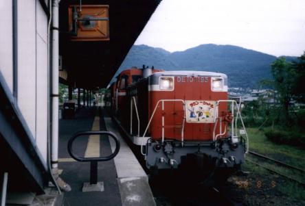 さて、かなり早くに由布院の駅につき、お約束でオレンジカードも仕切ってしまい、どうして時間をつぶそうかと思って何気なくホームに目をやると、おおお!客レがいるではないか!行き先は豊後森。ともかく乗ってしまおう。特急には森から乗ればいいや。ってことでいそいそとホームへ行く。全国的にも少なくなった客車列車。本当はここ久大線でも前もって客車に乗るように予定を組みたかったのだが、うまく組めずに諦めていた。それが、思いがけずに乗れるなんて嬉しさが込み上げてくる。早めに駅に来たかいがあったってもんだ。久しぶりに乗る50系。客車特有の機関車に引っ張られる振動と線路の音だけが静かな車内に響き渡る。夕暮れの車窓も実にすばらしい。