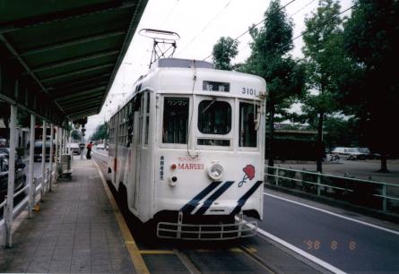 さて、とりあえず、赤岩口と運動公園、どちらが先でもいいので、来た電車に乗る。やってきたのは運動公園行である。それにしても、ここ、豊橋の路面電車はすばらしい。国道1号線の架線はセンターポール化され、景観がとてもよい。しかも、交差点以外は車が軌道敷に入らないように車線がきっちりと分かれている。なんか、ちゃんと、路面電車が街に溶け込んでいる感じだ。昭和40年代の不幸な一時期、全国各地にあった路面電車はモータリゼーションの名のもとに、次々と廃止されてしまったがここ豊橋を始め、最近、やっと、路面電車が見直されてきた。全く、うれしい限りだ。そうこう思いながら、片道、20分。とりあえず、運動公園に到着。すぐの折り返しに乗っても良かったのだが、懸案のおむすびを本当に電停のすぐ前にある運動公園で食べることにした。運動公園のとば口にしか入らなかったが、一応、競技場が奥にはあるらしい。炎天下であまり、人もいない。その炎天下の中、ベンチでおむすびを頬張る。とりあえず、15分後の次ぎ電車で戻りたいので、そんなゆっくりもしていらない。早々に食事をすませて、1度乗り換えて、赤岩口へ、ここには車両基地がある。なんか素