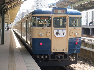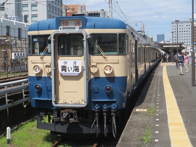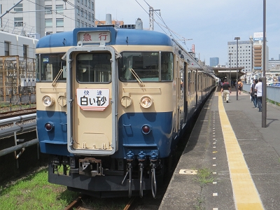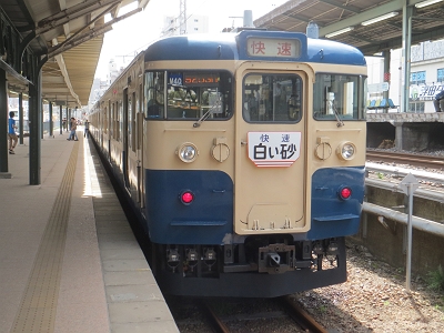 そして、7月6日、7日に走った、快速白い砂、快速青い海。当時は113系で走っていたのだが、113系が廃車となってしまったので、豊田の115系が使用された。雰囲気は似ているが、前面の塗り分けに違和感を覚えた。こんな感じでどれもこれも???な列車ばかりでした。