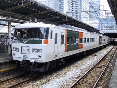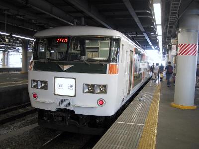 | 今回のイベントの休憩車として185系の付属編成が用意されました。車内は冷房も効いており、品川駅130周年の記念の駅弁等を持ち込んで、 食べることも可能でした。写真左、運行番号が7777Mになっているのは七夕にちなんでか? | |