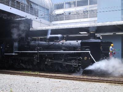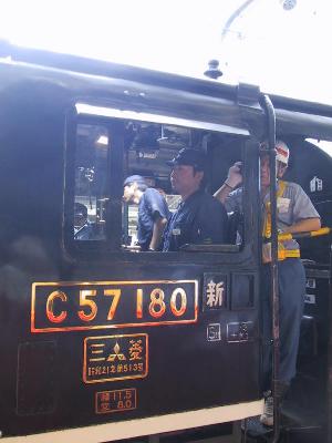 まばゆいばかりに輝くC57 180のナンバープレート 機関士、機関助士と共に、品川駅構内運転の準備は万端 あとは出発信号が青に変わるのを待つばかり。 |