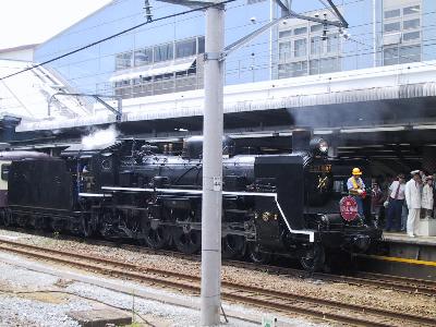 | 品川駅10番線に入線しているC57 180 見学用のこちらのホームは もちろんのこと、反対側の東海道線ホームからも、予期せぬSLの登場に 注目の視線を浴びた。 |