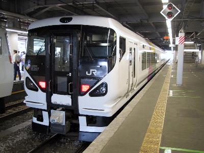 | 反対側、東海道線のホームから手前の電柱がちょっと残念。 | いよいよ動き出しました。対面の東海道線下りホームからだったので、 かぶりを心配しましたが、JR東日本の配慮でこの時間の東海道線の 下りの発着番線は反対側に変更になりました。 こういう配慮は本当に嬉しいものです。 |