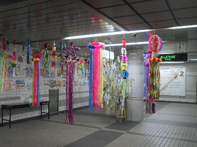 この日はちょうど、七夕、地元の営団地下鉄の駅では、 コンコースにご覧のような七夕飾りが施されていた。 |