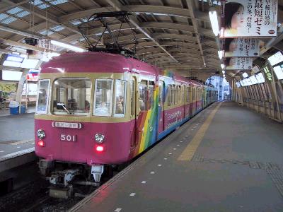 久しぶりに江ノ島に降り立ったが、さすがに行楽シーズンの土曜日ということで、まだ10時を回ったばかりというのに、かなりの観光客がいる。とにかく、江ノ電の駅へということで、細い道を5分程歩いて、江ノ電江ノ島駅へ。フリー切符なので、そのまま、鎌倉方面のホームへ向かう。そこで、なんと、大学の後輩に会ってしまった。まさか、こんなとこで会うなんて...彼のお目当ては500形のピンク色のポケットポストペット号の撮影とのことでした。本当に悪いことはできませんね。