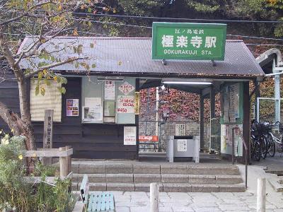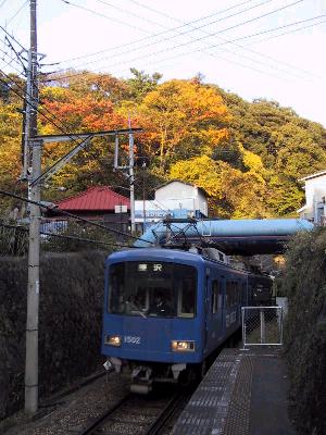| 関東の駅 百選に選ばれた 極楽寺駅 | 紅葉をバックに極楽寺に進入する |