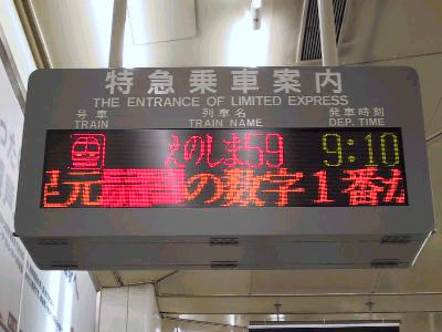 11月17日(土)、ふらっと江ノ電に行ってみたくなった。土曜日というのに、いつもと同じ7時に起床。毎度のことながら、鉄する朝は、なぜか、すっきり起きれるのが不思議である。とにかく、9時10分発のロマンスカーに間に合うべく新宿へ向かう。市ヶ谷から新宿線に乗ったのだが、あ、電車来てるって飛び乗ったはいいが、「本八幡行ドアが閉まります。」の放送にびっくりして飛び降りる。これでも、一応、東京都民なのに、田舎もん丸出しの失態を演じる。(笑)。新宿についたらついたで、新線新宿なもんで、小田急線とはものすごく離れてる。ここでも、迷子になりかける。どうにかこうにか、見慣れた小田急乗り場にたどり着き、江ノ島・鎌倉フリー切符B(1430円)と9時10分発のえのしま85号の指定券(610円)を購入した。えのしま号の方は空席がかなりある様子だが、紅葉シーズンで箱根方面の箱根湯元行のロマンスカーは14時まで満席との表示。特急ホームに行くと、9時発のはこね号30000系EXEが入線しており、多くの乗客がドアが開くのを待っている。程なくしてこちらにも9時10分発えのしま号10000系HiSEが入線してくる。こうして