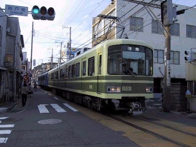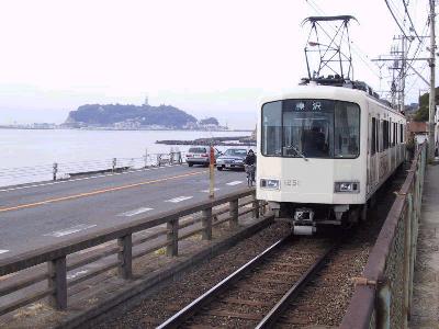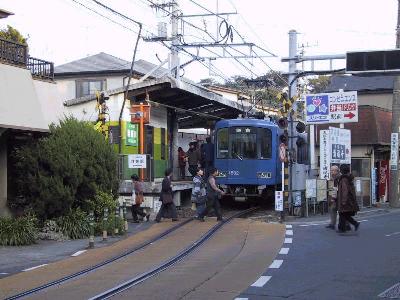 実は江ノ電は実は軌道である。江ノ島を鎌倉方面に少し走ると、次の腰越までが併用軌道にでる。非常に細い道路を我が物顔で通る様はちょっと痛快である。海岸沿いを走る江ノ電と共に、この風景も江ノ電の名所である。