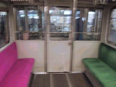 | 藤沢駅に停車中の501 ポケットポストペット号。 | 車内の様子。木製の床に、シルバーシートならずピンクシート!? |