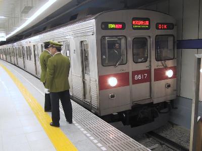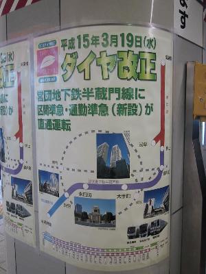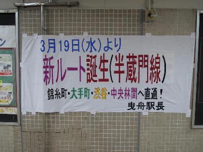 2003年3月19日 半蔵門線 水天宮前−押上間が開通し、同時に、東武伊勢崎線も曳船−押上が業平橋との複々線扱いという形で開業し、東急田園都市線中央林間〜半蔵門線〜東武伊勢崎線・日光線南栗橋までの100Km近い距離の相互直通運転が開始された。半蔵門線自体、錦糸町を通る初の地下鉄として都内の利便性が高まったわけだし、東武側からみれば、北千住経由の常磐線、千代田線、日比谷線経由以外の新しい都心直通ルートが増え、北千住での混雑緩和が期待できる。一方、東急田園都市線でも、これに併せて、ダイヤ改正が行われ、日中の急行が1時間あたり2本30分ヘッドから4本の15分ヘッドに倍増され、各駅停車を含めて、1時間あたり12本の列車が走るようになった。また1時間あたり2本の長津田止まりの列車も中央林間まで延長され、日中はほとんどの列車が中央林間行になるなど、利便性が向上した。また、半蔵門線を介して、日光、鬼怒川方面への東武沿線の観光地へも一直線に行くことができるようになるなど、神奈川、東京、埼玉の交通革命と言っても過言ではない効果が期待できる路線の誕生である。その半蔵門線の全線開通初日のリポートをしてみるこ