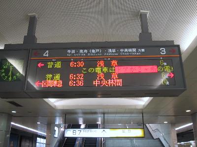 | 押上駅は2面4線になっており、1、2、3番線から中央林間方面行、4番線から東武線方面行が発着する。そのうち1番線は東武からの直通電車で、 押上折り返し電車は2番、3番を使用する。3番線で折り返す電車はいいが、2番線で折り返す電車は、4番線に発着する東武直通列車とホームが違うので、 押上より先に行く場合は手前の錦糸町で乗換えをした方が便利である。 | |