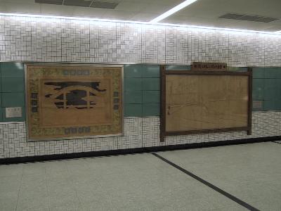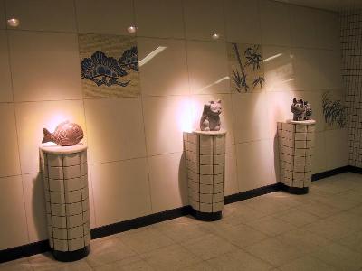 | 出入口から改札口までの地下通路に石でできた彫刻が置かれています。 | コンコースには江戸伝統工芸品もモチーフとしたパネルがあります。 |
