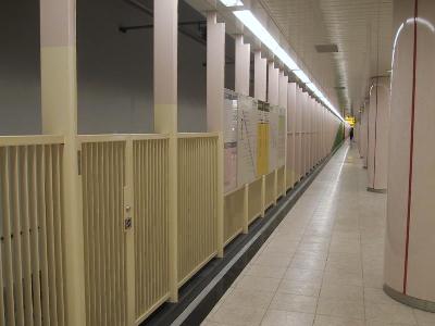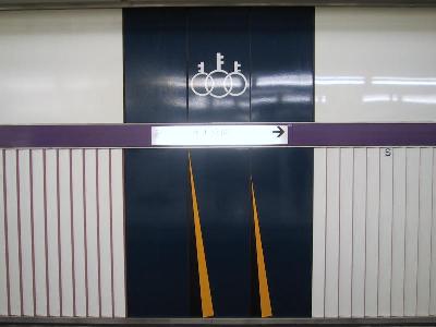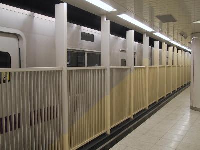 | 駅名標も江戸伝統工芸品になっています。 | この駅は上下2階建ての2面4線になっています。これは将来 有楽町線が豊洲から分岐してここまで乗り入れる予定だからです。 現在、このホームは営業では使われずにご覧のような柵がして あります。 |