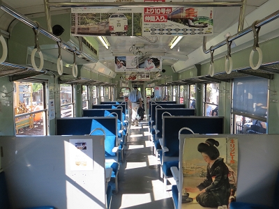 | 大多喜駅に到着です。 | 車内の様子 大糸線で使用されていた時のままです。 中吊り広告は演出のためわざと古いものが掲出されています。 |