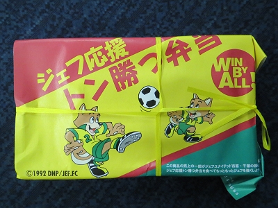 | ジェフユナイテッドの試合がある時に売られる 特製掛け紙の万葉軒のとんかつ弁当 ¥500 通常は480円だが20円はジェフユナイテッドの強化費に あてらている。 |