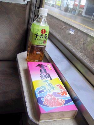 同じ列車で再び伊東に戻るが、発車すると伊豆高原乗り換え熱海行きと放送が入る。どうも伊豆高原で車両交換をするようである。他の乗客には迷惑な話なのであろうが、私的には、別の100系の編成に乗れるのでちょっとラッキー。さて、そろそろお昼ということで、下田で撮影の合間に買っておいた、金目鯛の押寿司をひろげる。なんか今日は朝から押し寿司ばっかりって感じ。(笑)きれいな包装の箱の中に、説明書きがあって、それによると、下田は金目鯛の漁獲量が日本一とのこと。こんなとこで、社会科の勉強になりました。当のお寿司ですが、金目鯛が昆布じめになっていて、なかなか美味なるものでした。ちなみに価格は840円です。そんな感じで、すっかり晴れて青さを取り戻した海岸線とおいしい駅弁とでしばらく至福の時を過ごす。