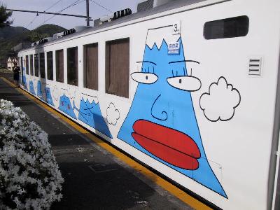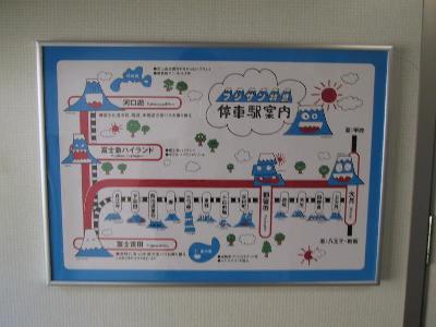 | 側面も大胆に「フジサンくん」が描かれています。 | 車内の路線図。こちらもフジサン君のオンパレードです。 実はこのフジサンには1つ1つ名前はついてます。 |