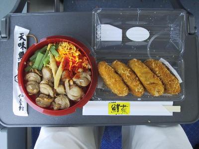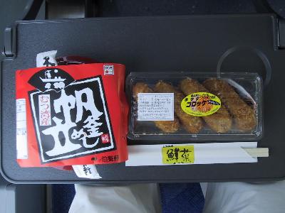 しかし、ちょっとお腹すいたな。幸い車販があるので、弁当を購入。列車内で買う駅弁は選択肢が少なく、あまり期待していなかったが、販売員に「ほたての釜飯が人気です。」と進められるままそれにして、蓋をあけてみたら、大当たり。大粒のほたてが10粒も、炊き込み御飯の上に敷き詰めてあった。うわーすっごい豪華じゃん。思わず感動。っていってるうちに、陸奥横浜に到着。5分間の停車中に、ホームで、地元特産品の販売を行うという車内放送が入る。とにかく、ちょっとホームに下りる。特産品というから、何かと思ったら、菜の花のドーナツとほたてのコロッケをそれぞれ4つ入りで300円での販売だった。なーんだって思ったが、せっかくだし、値段も安いので、ほたてのコロッケを購入した。かくして、この日の昼食はほたての釜飯とほたてのコロッケという豪華ほたてづくし。しかも、かなりの量でいささか栄養過多。さて、せっかくジョイフルトレインに乗っているのだからちょっと車内探検。自分の乗っている1号車は片側は2席のリクライニングシートが並び、片側は1席ずつのシートが並ぶ、1席づつの方は窓側に座席が固定できるようにもなっている。先頭部分には、誰 でも利用できる簡易展望シートがある。3号車は1号車と同じ構造で、中間の2号車はボックスシートになっているが、座席の部分が畳になっていてお座敷っぽくなっている。さらに、きらきらみちのくの走る沿線スポットのビデオ上映がなされている。列車の方は、野辺地に到着。ここで、方向が変わり、東北本線に入り、青森へ行く。この列車、さらに、この先、方向転換をして津軽線の蟹田まで行くが、自分は青森で下車。