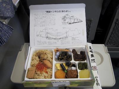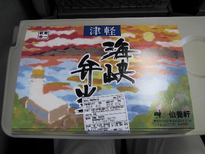 | 青森駅で買った海峡弁当 | 中には青函トンネルのあらましが書いてある。 弁当の中身も、シャケにいくらにほたての北海の海の幸が盛りだくさん。 |