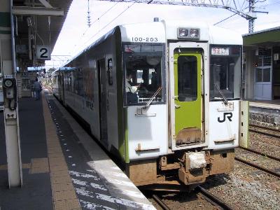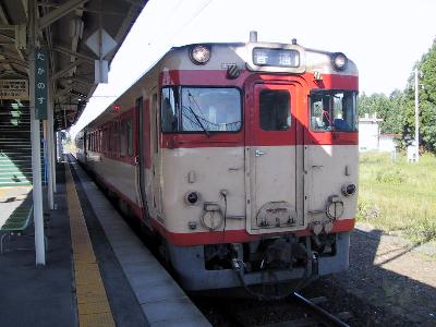 ところが駅に到着して降りようとしてびっくり、なんと大学の後輩がいるではないか。鉄に行くってことは旅立つ前の晩にチャットなんぞして分かっていたが、まさか、鷹ノ巣で遭遇するとは思わなかった。聞けば、彼は大宮から乗っていたそうで、これから、秋田内陸縦貫経由で北上線のSLの撮影に行くという。さて、急行よねしろは花輪線から直通してくる、キハ58を使った今では数少ない急行列車だ。今後の去就も注目されていたが、後から、今度のダイヤ改正で快速に格下げになると発表された。やはりそういうことになったか...。列車はアコモ改造を施した3両編成で、乗客もまばら。愛称名になった米代川を越えて、秋田へと戻ってゆく。せっかくの急行よねしろだが、この列車を東能代で降りる。