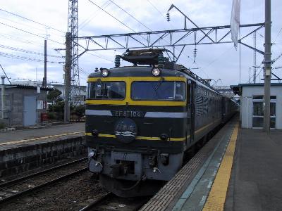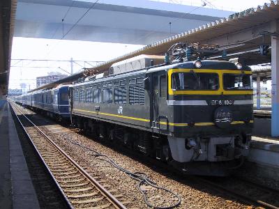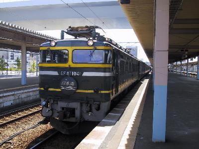 | 東能代に入線してきた日本海3号 牽引機はEF81 106号機トワイライトカラー |