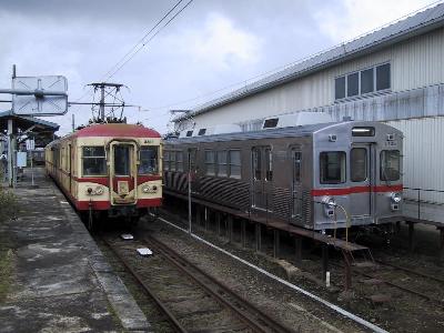 この十和田観光電鉄の車輌はなんと、元東急の3000系。最近では、5000系でさえ、置き換えがすすんで、ほとんど、廃車になったなかで、本当にまだ生きていたのか。と思うくらいの骨董品。それが、この10月でいよいよ、東急の7200系と7700系に置き換えられることになったのだ。さて、電車はすでに入線していたが、改札までまだ少し時間があるようなので、とりあえず、道路側から何枚か写真を撮る。改札の時間になりホームに入ると、ちょうど、7700系の試験列車が反対のホームに入ってきた。赤帯が撤去されており、久しぶりに昔の東急のオリジナルを見ているようである。3000系の方が東急でも少数派のノーシル・ノーヘッダーの3800系。車内に入ると、これまた、ワンマン用の整理券発行機と運賃箱を除いては座席も緑のモケットだし、東急時代の面影がよく残っている。吊り掛け音も本当に懐かしい。とりあえず、この電車に揺られて、車庫のある七百(しちひゃく)まで行く。