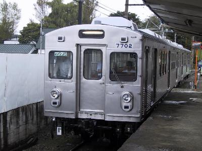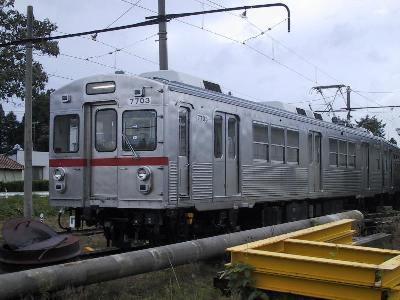 | ちょうど、三沢に7700系の試運転列車が入ってきました。 前面の赤帯のない、昔の東急のオリジナルの顔です。 |