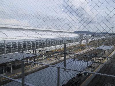 | 線路の様子。真ん中の四角形の部分はスプリンクラーです。 奥にスペースがあるのは将来、新幹線用に線路が敷かれるためです。 |