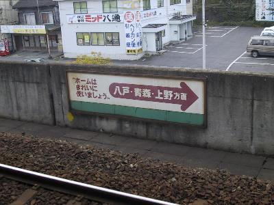 結局、自分のボックスには、盛岡から、下席に一人乗ってきたきり。だったら、俺も下がよかったよ!たぶん、これはキャンセルが出たのではなく、3連休きっぷで座席だけ押さえときながら、予定が変わってもキャンセルしなかった輩のせいなんだろうな。もうこういうのは、マナーの問題だよね。乗らなくなったのならちゃんとキャンセルしてよね。最近、この3連休きっぷや土日きっぷは指定席も乗れるようになってきたけど、このへんをなんとかしてもらいたいよ。自分はまだ乗れたからいいけど、こんなことのために、本当に乗りたい人が乗れなかったら、問題だと思うのだが。さて、少々腹を立てながら、はつかりを八戸で降りる。