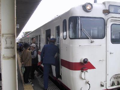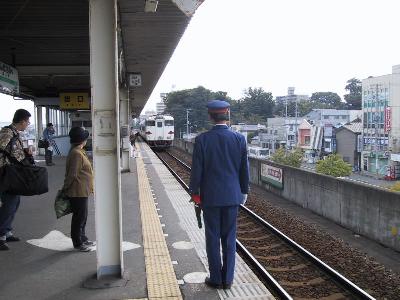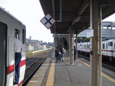 | これから八戸線に乗ります。 キハ40 八戸駅 | 鮫に到着。タブレット交換。□から○へ。 |