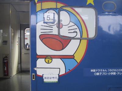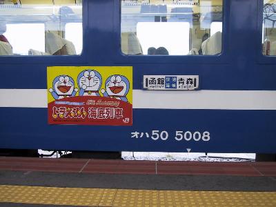 そして、青森からは、2日前に大湊で指定券を取った海峡で竜飛海底駅、そして、北の大地北海道へ向かう。海峡は今度のダイヤ改正で電車特急、白鳥・スーパー白鳥に置き換えられることになっており、これで、定期の座席客車列車は絶滅となる。ED79にはドラえもんの大きな顔と、50系客車にはこれでもかというほど、ドラえもんキャラクターのシールが張ってある。鉄道ファンからみれば、オリジナルの姿が好ましいものだが、竜飛海底駅を案内してくれたJR北海道の人に聞くところによると、ドラえもんのおかげで乗客が50%近くも増えたそうである。子供をだしに使い、当然、子供だけじゃ乗れないから両親がついてきて、下手すりゃ、じいちゃん、ばあちゃんまでついてくる。とのこと。乗客数の減っている海峡線では、ドラえもんはまさに、22世紀からやってきた救世主なのだ。