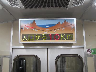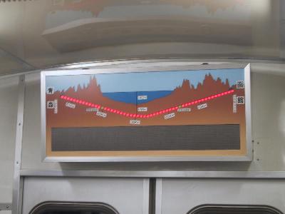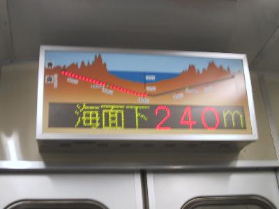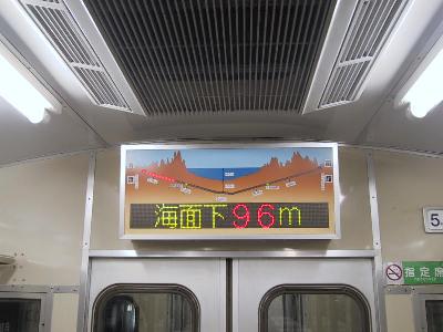 | 50系客車内の電光掲示板 5kmごとに表示されます。 | 海面下96mまで下がりました。 |
