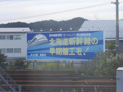 そろそろ、はつかりの入線時間になりホームへ降りる。自由席の方はそれなりに列ができているのだが、指定を取ってあるので、こういうときに、のんびりしていられる。八戸をでて、しばらくすると、すでに、その先の新青森までの新幹線の工事が始まっており、建設中の高架橋が見えてくる。しかし、新幹線はこの先は、在来線から大きく内陸の方を離れて通るので、車窓から眺められるのはここだけになる。陸上トンネルでは最長の八甲田トンネルなどもあり、今のところの予定では2012年の完成予定だそうである。さて、青森まで逃げると思われていた、先ほどの583系団体列車であるが、野辺地でこのはつかりが追いついてしまい、ここで、抜かすことになった。これなら、青森で確実に捕まえられる。