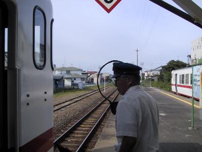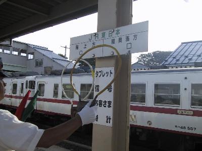 さて、帰りは、運転台の直後にかぶりつく。次の交換駅は陸奥湊。列車の交換はしないが、タブレットは当然行われる。