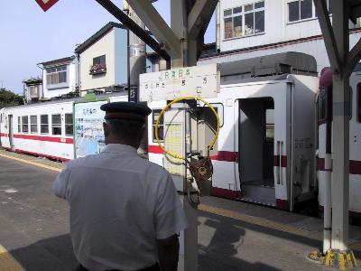 八戸では八戸線でちょっと時間潰し。新幹線開業に合わせて、八戸線も高速事業化されることになり、全国でも珍しくなっている通票閉塞がなくなってしまうのだ。そんなわけで、キハ48に乗り込んだ。八戸を出てすぐ、まずは貨物駅で交換のため待ち合わせだが、本八戸まではCTC制御である。貨物駅を出て、しばらくすると、左に八戸臨海鉄道が分かれてゆく。まずは鮫まで乗ってみる。鮫で列車交換があり、早速、駅員がタブレットの交換。原始的な方法に見えるが、タブレットを持っている列車だけが通れるといういたって、単純かつ最も安全な手法である。が、実際には、続行運転などもあり、見た目ほど単純なシステムではないのだが...。ここ鮫で、タブレットは○から□に変わる。そして、今までのタブレットは交換列車に渡された。