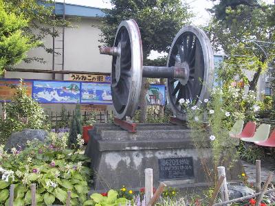 | 鮫駅 | 駅前にある8620機関車の動輪 |