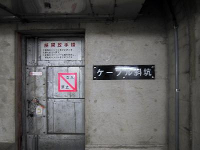 | 竜飛海底の駅名標 ホームではなく、通路にあります。 | ケーブル射坑 といっても、ケーブルカーのものではありません。 |