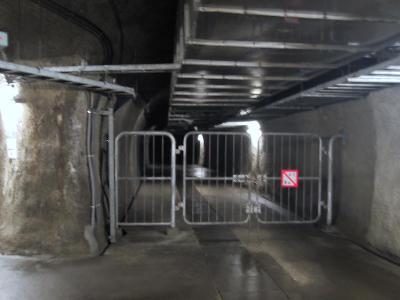 車掌も繰り返し、見学専用車輌に乗ってる人以外は降りれないとの案内を繰り返す。が、普通の人ならこんなとこで降りようとは思わないだろうが...。以前に吉岡海底に降りたことがあるが、このときも、ホームがすごく狭かった印象があるのだが、やっぱり、ホームの幅はすごく狭い。幅は30cm〜40cmくらいであろう。だが、実際の乗車口には直角方向に通路が繋がっているので、乗り降りする際に危険は感じない。薄暗いトンネルの側道を案内の人においてかれないように、ついてゆく。トンネルは作業抗などの関係で、ちょっと迷路のように分かれているところがあり、下には工事で使っていたトロッコの線路も埋まっているので、ちょっとインディージョーンズみたいな感じ。まず、ここで、大きな、手荷物は預かってくれる。そして、外へ出るケーブルケーに乗るために、風門に行く。これは、トンネル内の換気をするためと万が一の火災に備えて、常時、風速1mの風が送られているのだ。そのため、風を仕切るのである。門と行っても次のような大掛かりなものである。まず巨大な壁のようなシャッターが警報音と共に上がるので、先に進むと、前にはもう1枚同じようなシャッターが