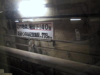 さて、記念館に戻って、ちらっと、館内をみたけど、大した展示はなく、再び案内係に連れられて、ケーブルカーで地下へ舞い戻る。そこで、いろいろ説明。言うまでもなく、超難工事だったこと、途中で、水がでて、水没しかけたこと、シールド工法が使えず、爆薬による発破で掘り進めて、その土砂を運び出すという、ほぼ、手堀に近い状態。もう、まさに、プロジェクトXの世界。