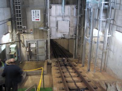 そして、今回の目的だった、地上へあがるケーブルカー乗り場に到着。このケーブルカー、ちゃんと免許路線になっているため、ケーブルカー完乗するためには乗らないといけないのだ。(笑)。ケーブルカーは車輌1両を巻き上げる方式。双行式が一般的な中、鞍馬寺とともに、珍しい方式である。また、直線を一定角度で登ってゆくというのも、珍しい。ひたすら直線なのだから、はるか先に終点が見えてもいいのに、なぜだか、終点は見えてない。実は、地上の駅の手前に先ほどと同じような風門があるからだ。地下ケーブルカーなのだが、雰囲気としては立山黒部アルペンルートと同じような感じ。トンネルの中をひたすら登ってゆく。登ってゆく途中で、出口付近の風門が開き、地上の明かりが見えてくる。なんかちょっと感動。(笑)。無事、地上の駅に到着。すると、また風門は閉じられた。さて、久しぶりに、外界にでる。光のまぶしさが目に沁みる。