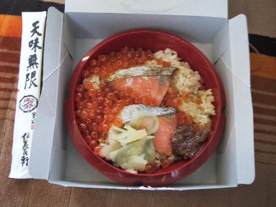 | 青森駅で仕入れた「しゃけいくら釜めし」 | 中身はこんな感じ。しゃけといくらがこんなにはいってます。 |