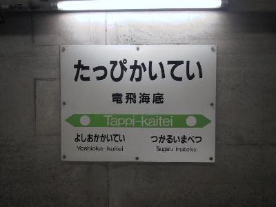 さて、話を少し戻して、青森を出発した海峡は、中間にカーペットカー、ドラえもんカーを連結して豪華8両編成。そのうち2両が海底駅見学専用車輌だが、竜飛海底駅の車輌には自分も含めて、12人。連休の割には少ない。しばらくすると、車掌がやってきて、海底駅見学の要領について簡単に説明しにやってくる。一通り聞いて、とりあえず、竜飛海底に着くまでに食事をしておかなければということで、急いで、駅弁をたいらげておく。で、いきなり、心臓が止まりそうになった。前の車輌から、のび太くんの着ぐるみが現れたのだ。これには、本当に驚いた。子供は喜ぶだろうが、あいにく、この車輌は自分が一番の年少者で、ほとんどが、50、60のおじさん、おばさんでちょっとしらけ気味。それでも、のび太くんは手を振って歩かなくてはならないところがちと辛い。(笑)。どんな仕事も大変なものです。(苦笑)。さて、蟹田からはJR北海道の乗務員に交代して、海底駅を案内する職員も乗り込んできた。そこで、若干詳しい説明と、青函トンネルに入るタイミング等の説明があった。そして、大小9つのトンネルを抜け、いよいよ世界最長53.8kmの青函トンネルに入った。トン