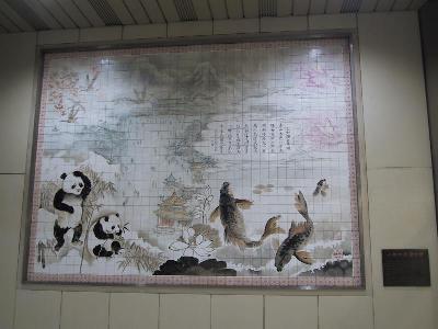 | それでは、ここから乗ります。 盛岡駅 | 新幹線上野駅コンコースにあるタイル画 上野動物園のパンダや不忍池の鯉などが描かれている。 |