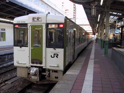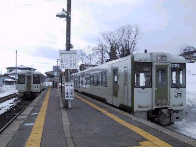 さて、夕暮れせまる新潟を出発したあがの4号は110系気動車の3両編成。夕方のせいか、少し立ち客も出る程度の混雑。新津までは信越本線の架線の下を進む。快速のため、新津までノンストップだ。新津から磐越西線に入り五泉に到着。ここで、過半数の客が下車し、ちょっと車内が落ち着く。五泉は、数年前まで蒲原鉄道が出ていたが、すでに廃線になってしまっている。新潟交通といい、蒲原鉄道といい、新潟県内の情緒ある私鉄各線が次々と廃止になってしまったことは本当に残念である。