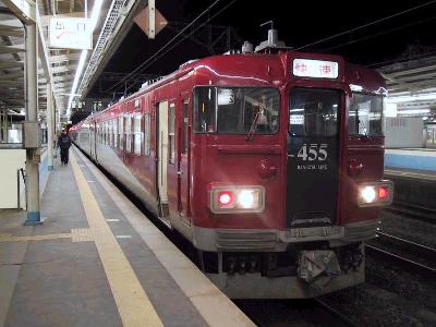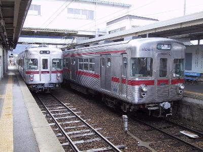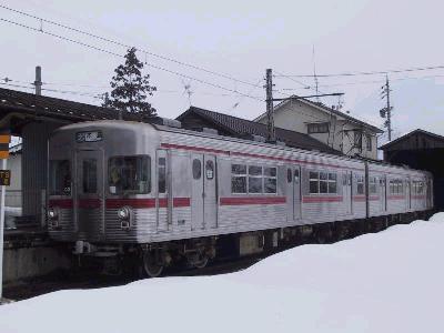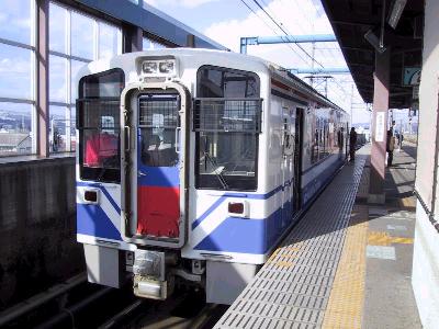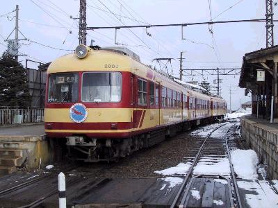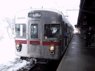 2000系特急車両は3両編成なのだが、ホームは踏切の関係で、長野方にしか伸ばせなかった。しかし、その手前に、本線からのポイントがあるというわけだ。そこで、本線からポイントを渡ってきた電車は、踏切に干渉しないようにするため、切替して、前方に移動する。出発するときはこの逆で、一旦、バックしてポイントまで下がって、切替を行い、本線にでていくというわけだ。なんか苦肉の策だね。でも、ちょっとした鉄の名所になってるんだから、それはそれでいいか。(笑)。