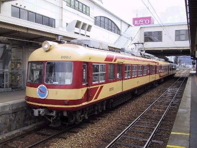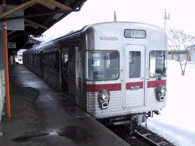 | 湯田中駅に停車中の2000系 本線に行くポイントを踏んでるのがこの写真からもよくわかる。 このため、一度バックをしてから本線上に出る。 |